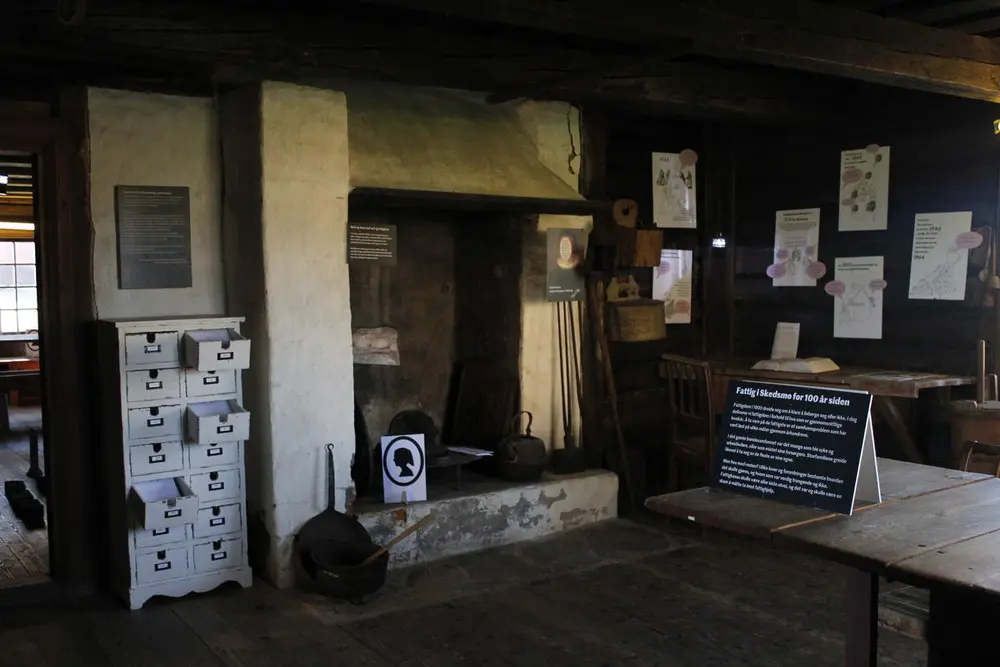Utstillingen forteller om hvordan lovverket og situasjonen for de fattige har endret seg fra de første fattiglovene kom til i dag, som begrepet fattig ikke lenger finnes i lovverket! Presten på Huseby i 1809 mente at ingen burde motta fattighjelp før de hadde forsøkt på alle tenkelige måter å skaffe seg nok mat på, inkludert å bruke mose i brødet. Statistikken viser at nesten ingen av de fattige var det "selvforskyldt", av drukkenskap eller latskap, men de hadde mistet sin forsørger eller var selv kroppslig ute av stand til å forsørge seg selv.
