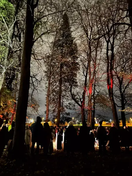 Det var kaldt ute, men magisk stemning med kirkebenker under trærne som kirkehvelving. Kirkebenkene fikk vi gratis fra Den Norske Opera, men med noe kostand til frakt. Det var tross alt 14 stykk og både tunge og store. De gjorde allikevel til at stemningen ble både høytidelig og annerledes.