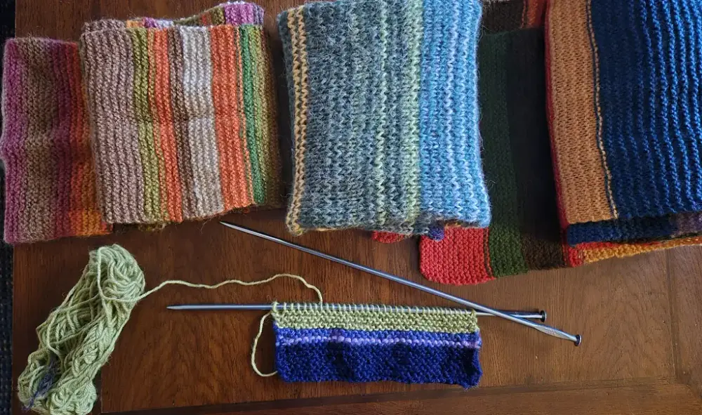 Vi samskaper på Skedsmo Bygdemuseum og strikker ett eller flere skjerf av restegarn gjennom sommersesongen.