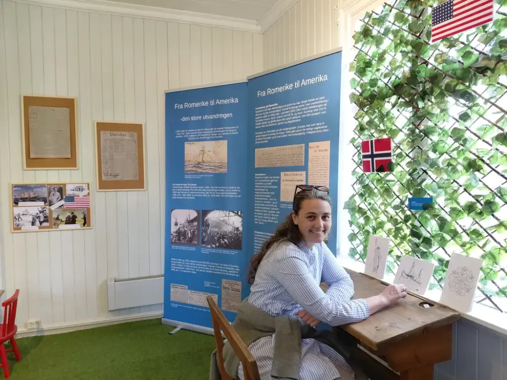 Prosjektleder for "Fra Romerike til Amerika" er Juliane Husvik Sukkestad, her i utstillingen "Med eventyr på reise" på Stein skole. Trine Grønn Iversen/MiA
