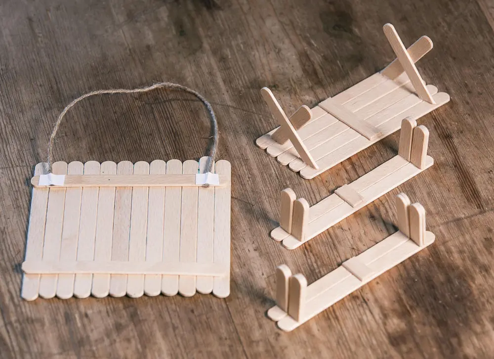 Til bordet er beina to ispinner delt i to. Til benkene er beina en fjerdedel av ispinnen. To ender er limt sammen for å gjøre beina mer stabile. Restene har vi brukt midt på bordet og benkene for å holde pinnene sammen. Vi har brukt vanlig skolelim.