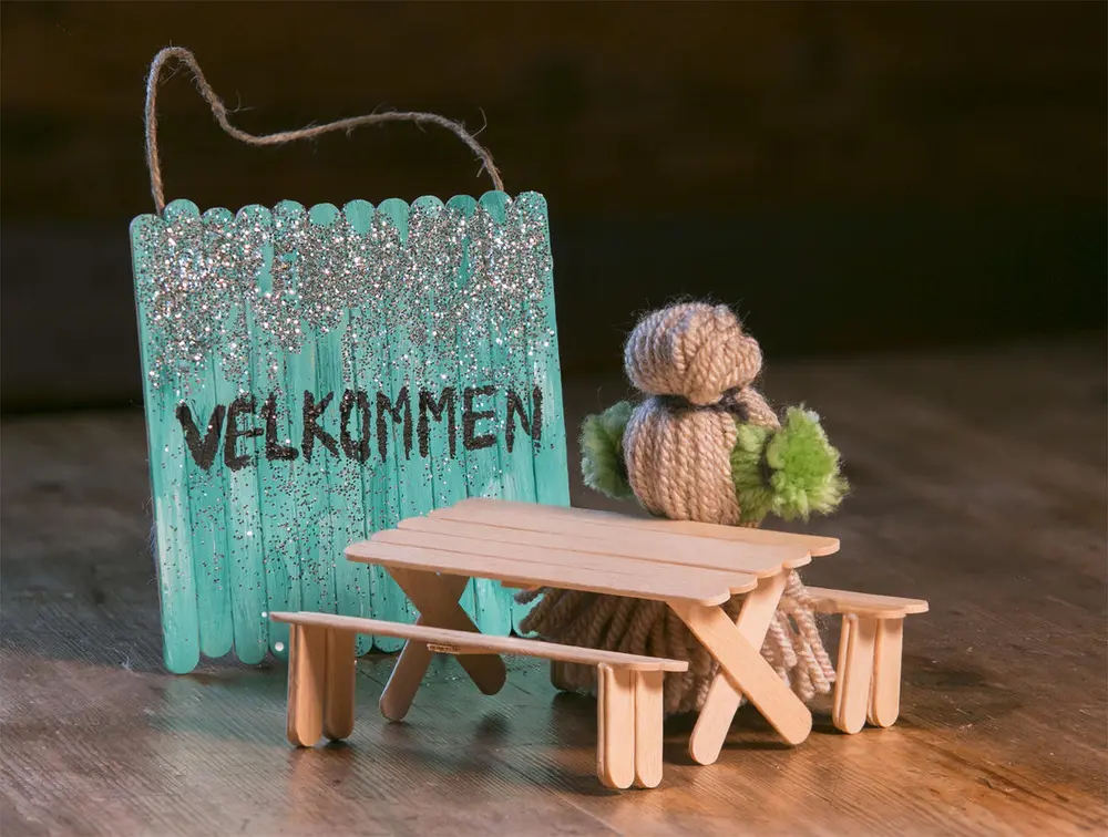 Ispinner er fine til å lage mye forskjellig. Her har vi laget skilt og bord med to benker.