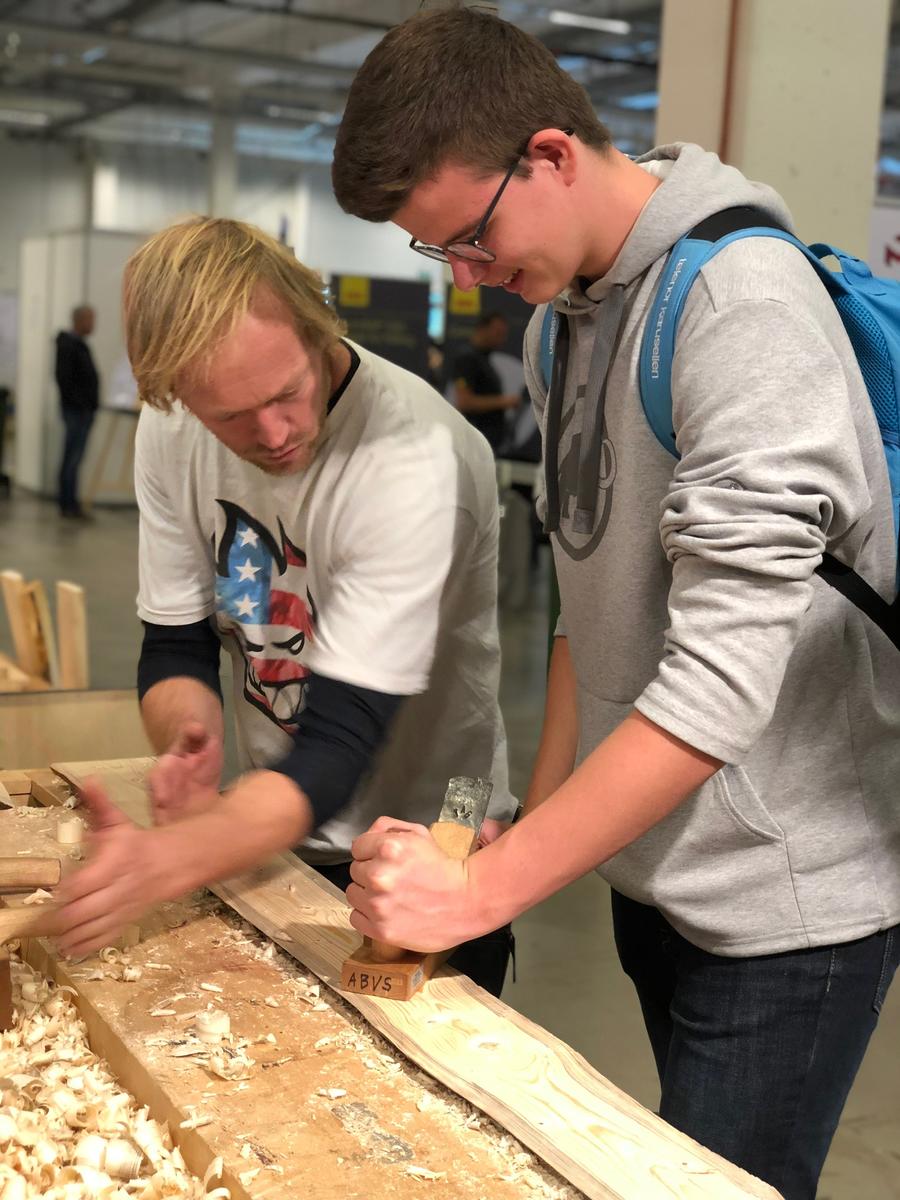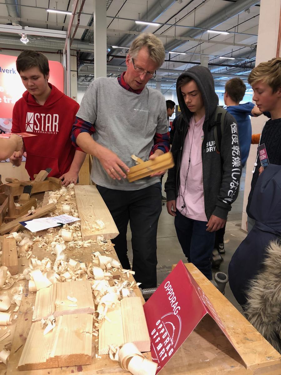 Men også Tradisjonhåndverks samarbeide med Akershus bygningsvernsenter er viktig når det skal formidles håndverk for elever i grunnskolen. Det var mange elever som stilte seg i kø for å prøve å høvle. Med gode læremestere i Phillip og Per-Willy gikk det unna så flisene føyk.