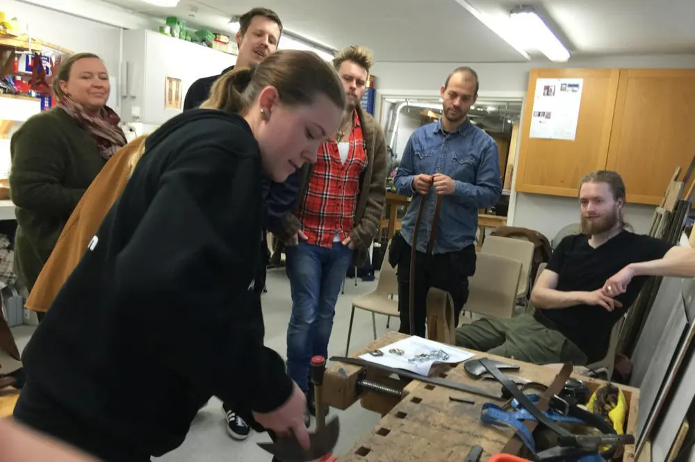 Salmakerlærling Katrine demonstrerer kutting og behandling i ulike typer lær og verktøybruk. Et av målene for workshopen var å få prøve ulike teknikker og metoder, på-tvers-samarbeid og å kunne bruke ulike materialer også i egne produkter. - 2/24
