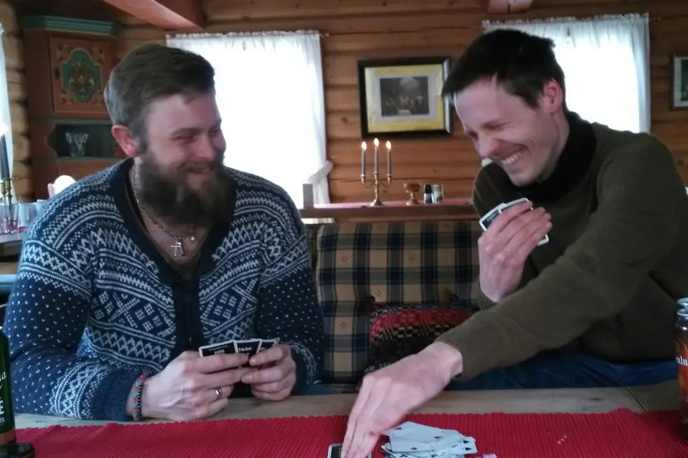 Etter middag er det klart for sosialisering og kortstokken går varm, her ser vi trebåtbyggerlærling Bjørn og møbelsnekkerlærling Morten som slår et slag. Og jeg mener også å ha hørt noe om at det er visse samarbeidsprosjekter på gang. Bjørn har allerede produktutviklet kule forsterkere og bygger spesielle one-of-a-kind gitarer, mens Morten leier et verksted hvor han tar på seg kundeoppdrag etter ordinær arbeidstid. Supre gutter! - 20/24