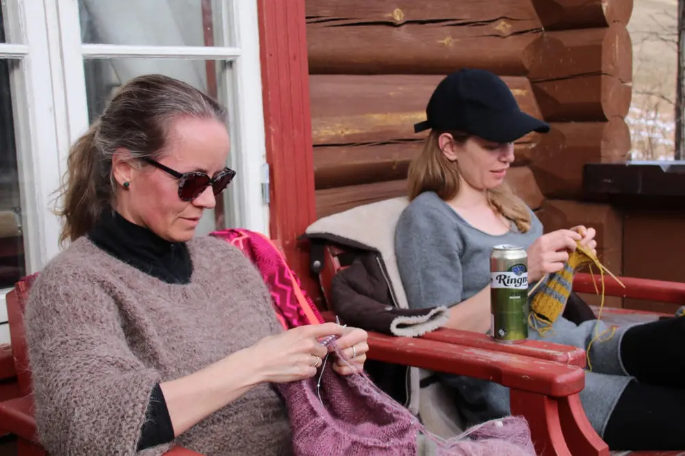 Etter en lang arbeidsøkt er det godt å slappe av og nyte både vær og strikketøy. Strikkelærling Lena t.v. lærer kurvmakerlærling Kristine å traktere strikkekunsten, og som nybegynner starter hun like godt på et sokkeprosjekt. Godt pågangsmot og bra jobba. Samlinger som dette er GULL, og de nettverk som knyttes og den kunnskap som deles er uvurdelig. Samtidig er lærlinger i små fag ofte alene faglig og i bedrifter, dermed er den erfaringsutveklslingen de får ved å være sammen med likesinnede viktig for motivasjonen og fremtidige relasjoner. - 15/24