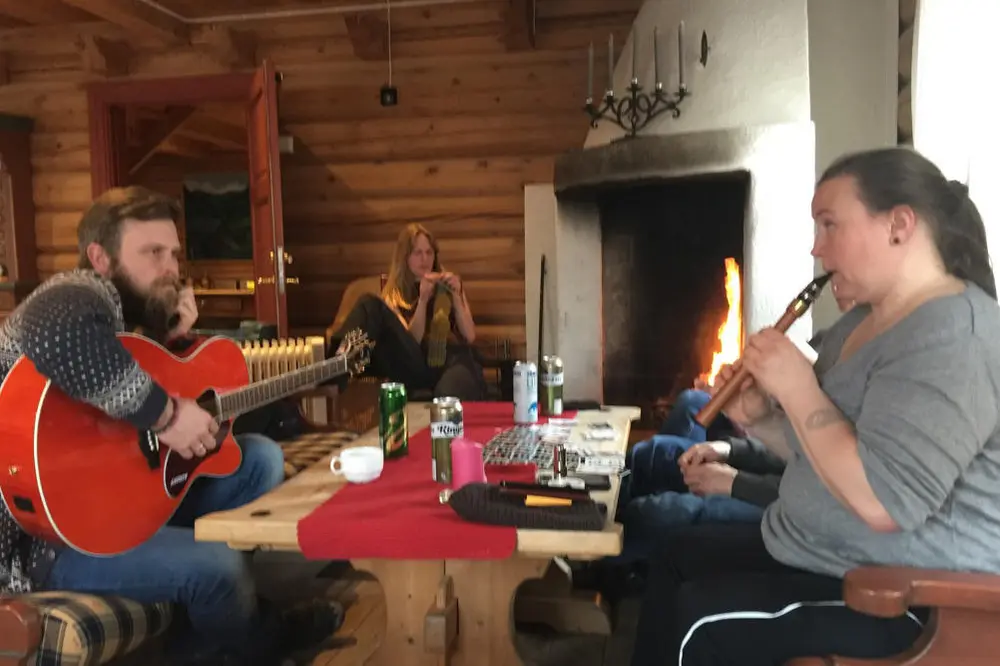 Samlingstund med peiskos, strikketøy og musikk. Mange av våre lærlinger har spesiell musikkinteresse og profilerer seg også på dette området. Her ser vi Bjørn på gitar, Kristine T med strikketøy og Kristine K som prøver fløytene til Anders. Elisabeth har med seg en torader og Unni en syngebolle. Ellers vanket det lokal konsert på Låven med Hallingmusikk, så etter å ha investert i CD´n til Birger & Band, gikk soundblasteren for full musikk, Å HUTTETU 🙂 - 21/24