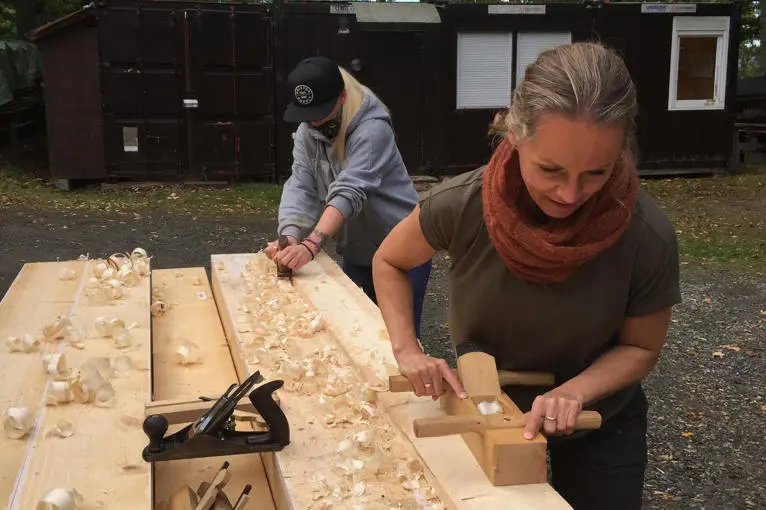 Smedlærling Eilen og strikkehåndverkerlærling Lena høvler emner som skal brukes til å restaurere trebygninger i gamle Drøbak. Høvlene blir laget spesielt på bygningvernsenteret, for at det ferdige produktet skal få et riktig autentisk utseende til sitt bruk. - 4/24