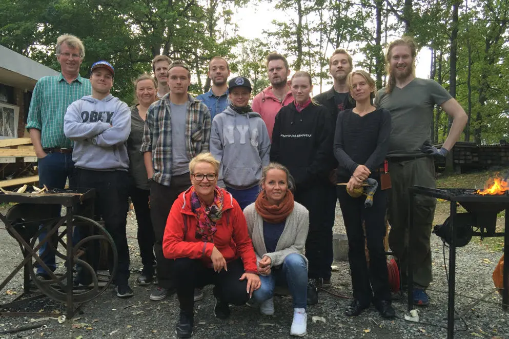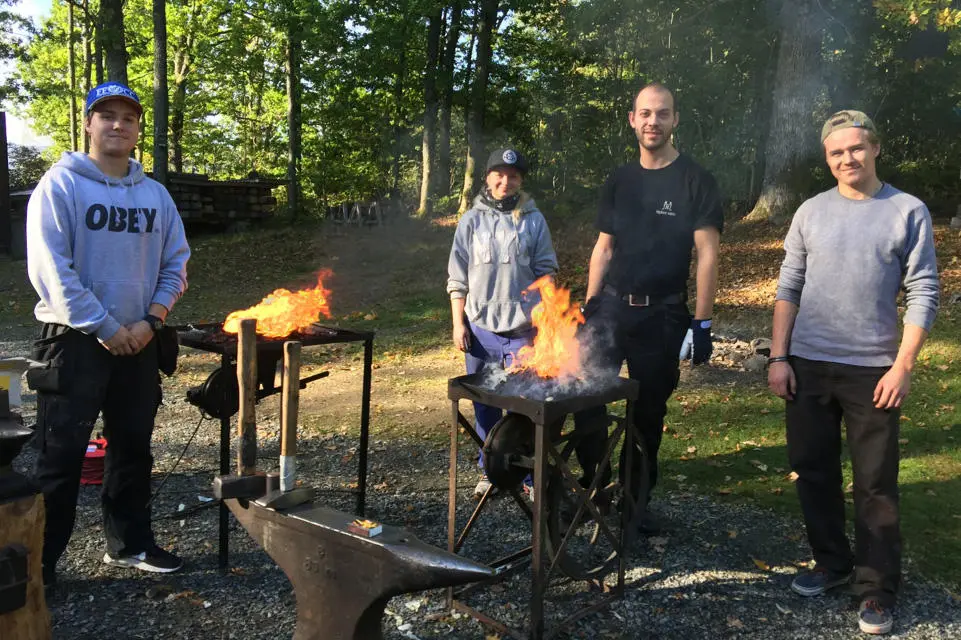 Smedlærlingene Marcus, Eilen, Bjørn og Lars har fyrt opp essa og er klar til å instruere oss andre i kunsten å smi. Vi lærte fort hvor viktig det er med et godt håndlag for hammerslag og riktig varme for at jernet skulle få riktig glødetemperatur. - 3/24