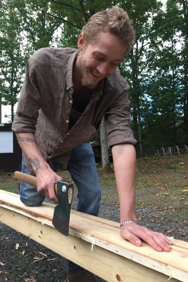 Trebåtbyggerlærling Tord er vant til å svinge øksa, og her demonstrerer han øksebruk for oss andre. I trebåtbyggerfaget er det sjelden rette linjer, så de materialene som skal brukes må enten bøyes med varme og damp eller som her formes med håndverktøy. - 5/24