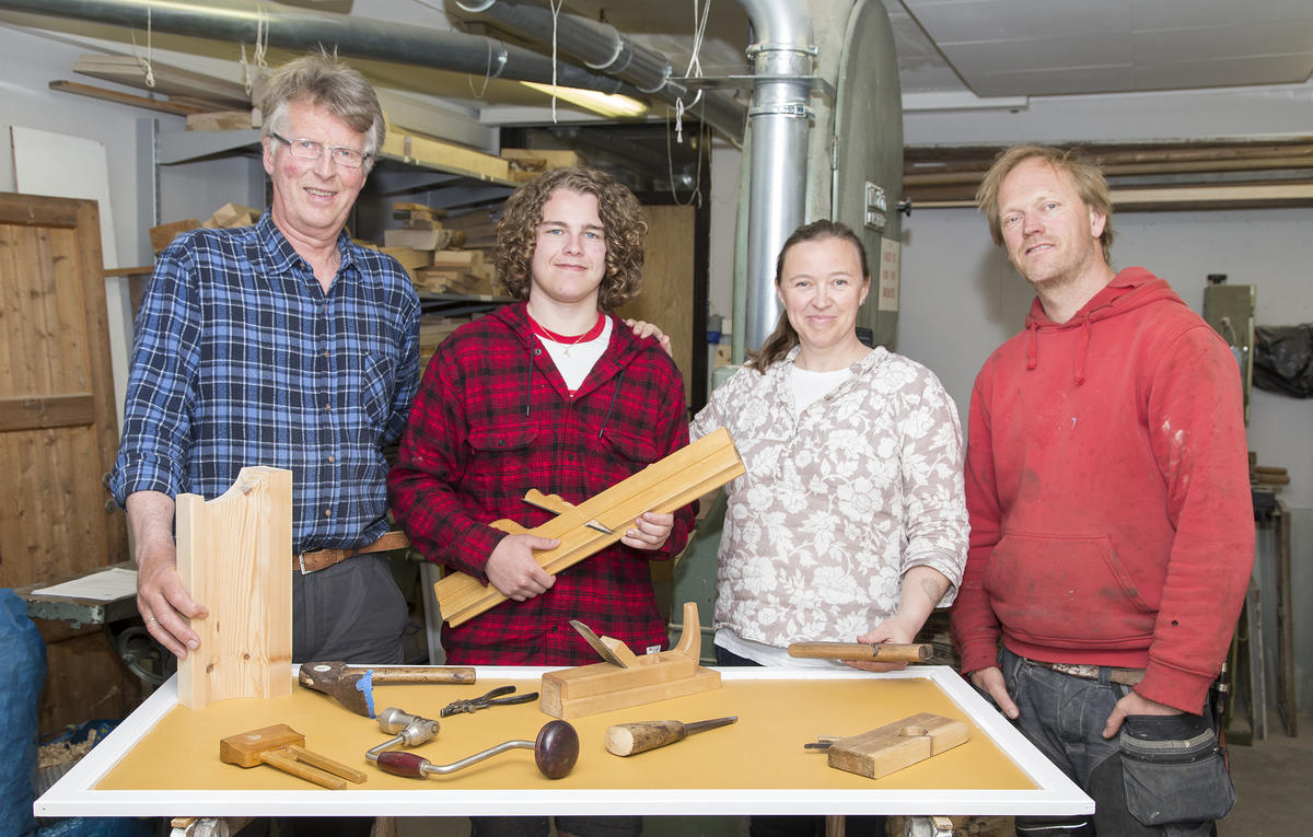 F.v. Per Willy Færgestad, tømrermester og seniorrådgiver i Akerhus bygningsvernsenter, er fagansvarlig for lærling Markus Klubnes som holder en fletthøvel. Kristine Kandal-Ilagsmoen, faglig veileder i Tradisjonshåndverk og ansvarlig leder for opplæringen. Instruktør Phillip Skaug, tømrer og driftsleder på Follo museum.