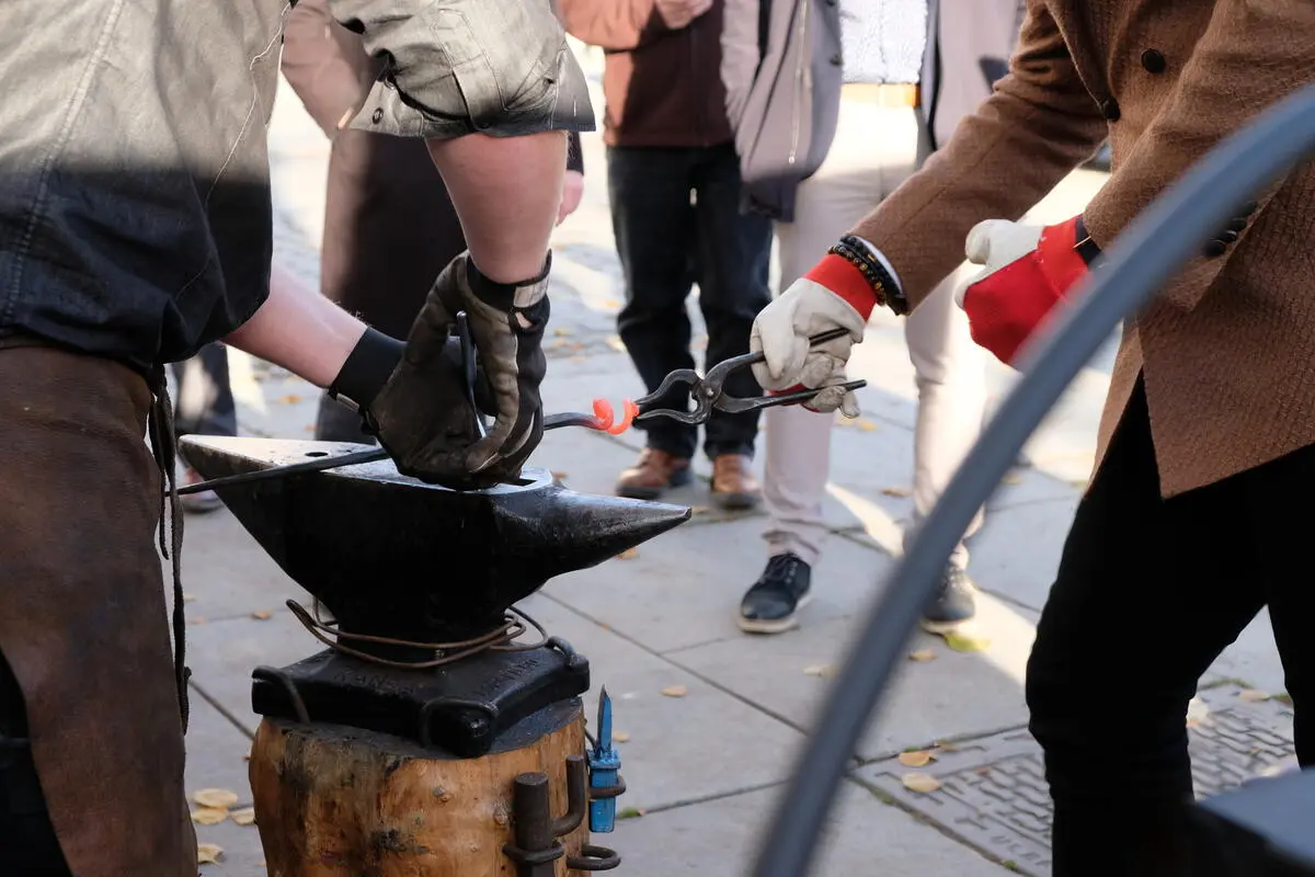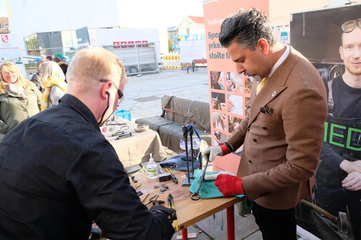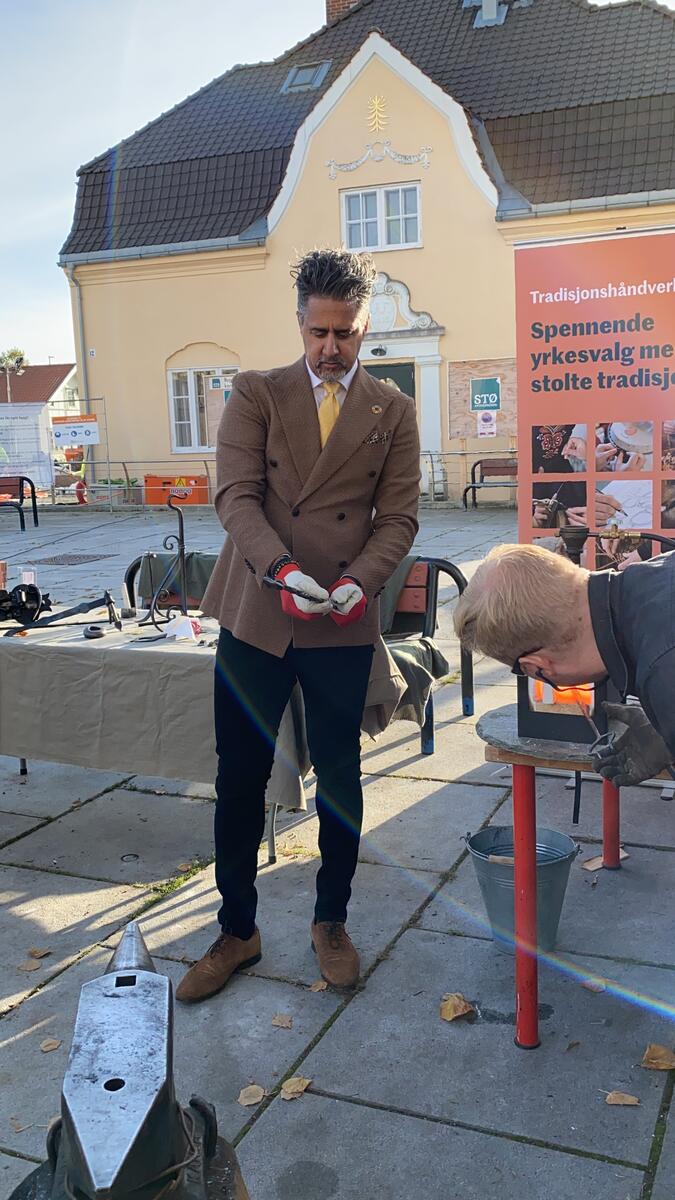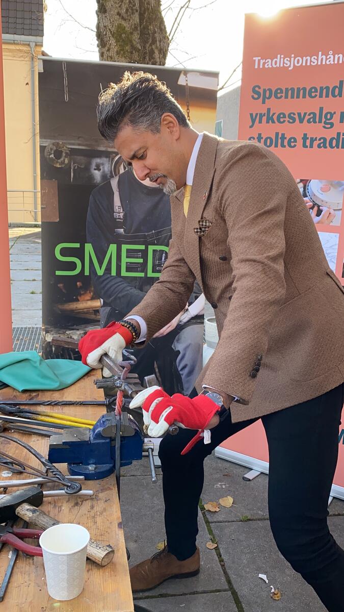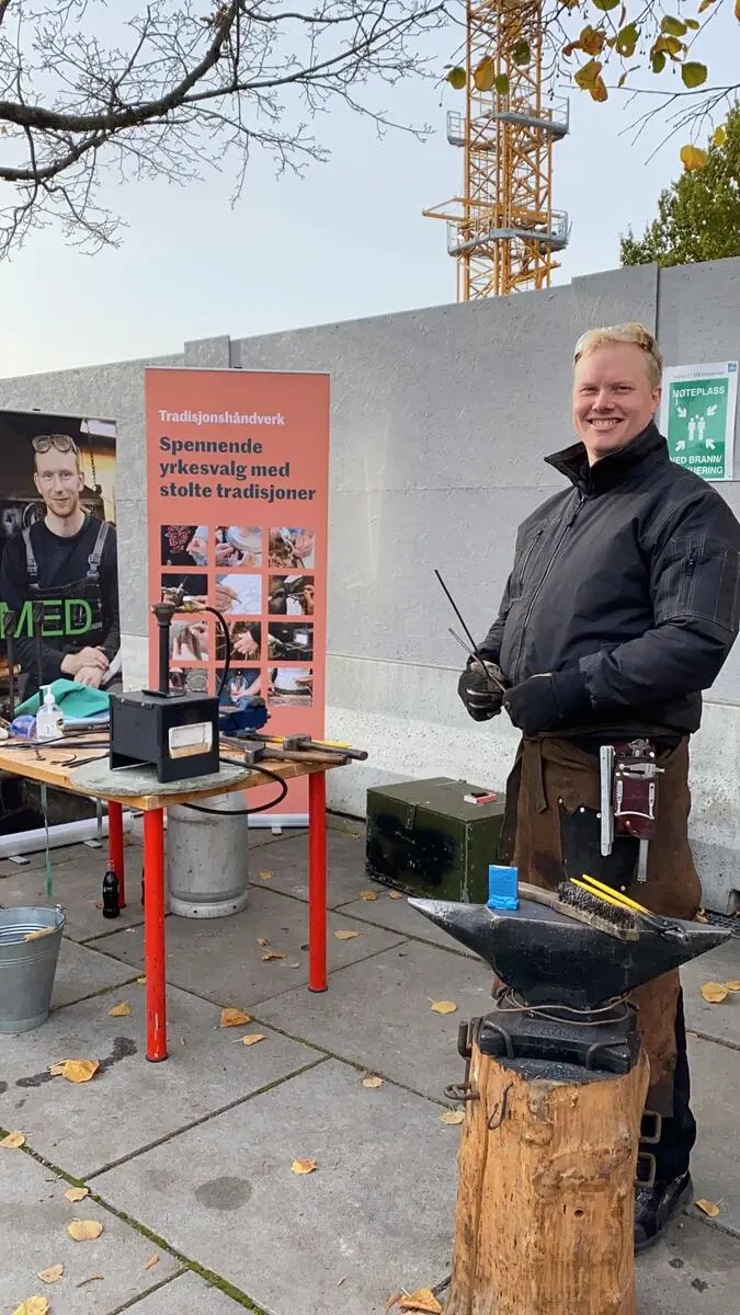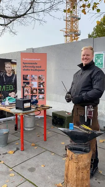 Johannes Barstad Grøstad, smedlærling hos kunstsmed Steven Carpenter i Kongsberg, hadde laget et flott opplegg for Raja, hvor han kunne velge både å smi brusåpner, krok eller deler av et grillspyd.