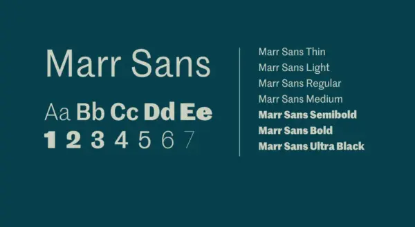 Marr Sans er en moderne, solid og tydelig identitetsskapende font med sterk karakter og røtter tilbake til 1870. Den har kvaliteter som høy lesbarhet, den er skarp med en særegen stil, og er mer individuell og eksentrisk enn de mer vanlige sans seriffene. Typesnittet består av mange ulike vekter, som gjør den fleksibel og funksjonell for alle typer bruk.