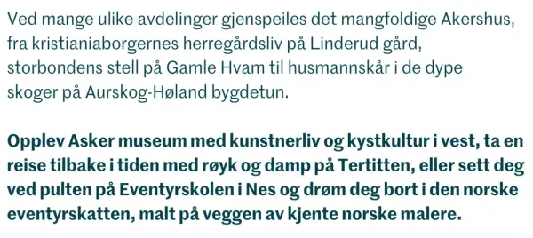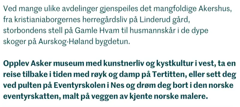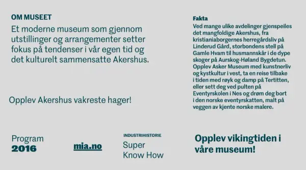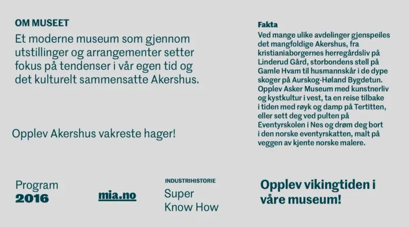 Valg av profilfont er gjort på bakgrunn av behovet for typografi som er identitetsbyggende med sterk karakter, er samlende for mange og som er enkel å implementere på tvers av museene. Ved at alle avdelingene bruker samme typografiske uttrykk fungerer de godt sammen selv om de har ulike farger og billedmateriale.