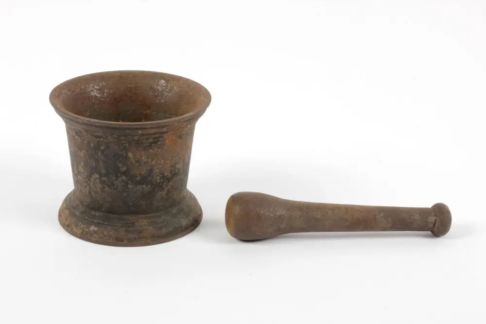 Den avbildede morteren og pistillen er en av flere gjenstander i Ullensakers Bygdesamling som vi har lite informasjon om. Det eneste som er registrert på gjenstandens historikk er at den ble tatt inn i samlingen i 1935.