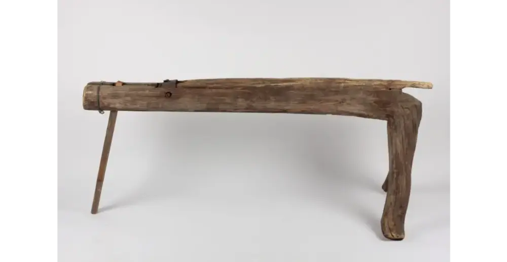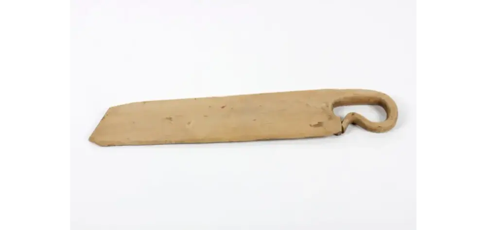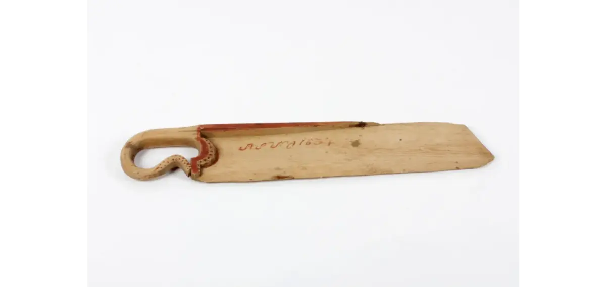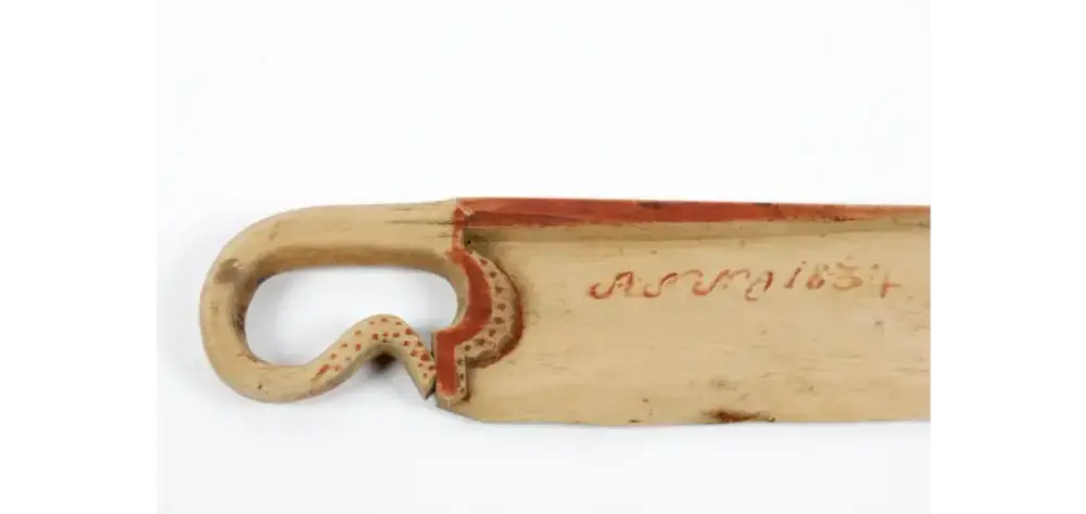 Denne skakekniven, som vi har i samlingen, har en gang i tiden fått påmalt en brunrød farge, kanskje for å etterligne svimerker. Som man kan se på bildene er den også påmalt teksten «Anno 1834».