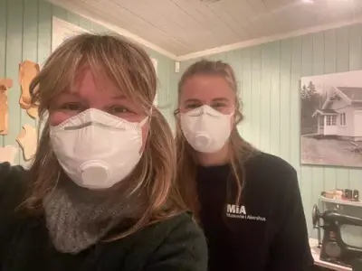Stedsansvarlig Sigrid Tveiten Roholdt og fagkonsulent Maren Rogstad i beskyttende støvmasker under flyttingen.
