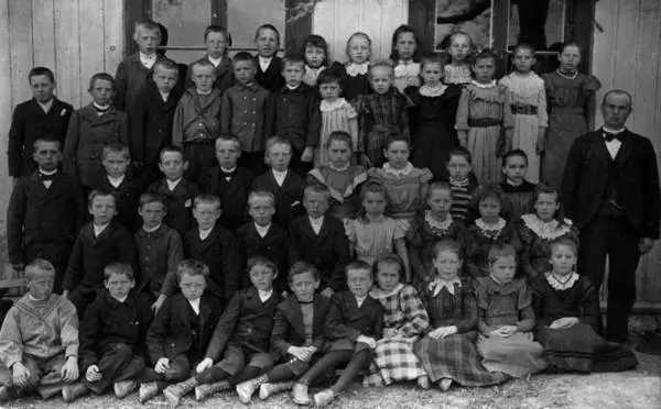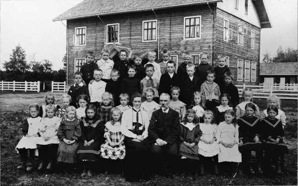 Mogreina skole i 1917. Thorolf Lyssand og Alvhild Hovden, lærer og lærerinne, står til høyre. Bildet er hentet fra digitaltmuseum.org