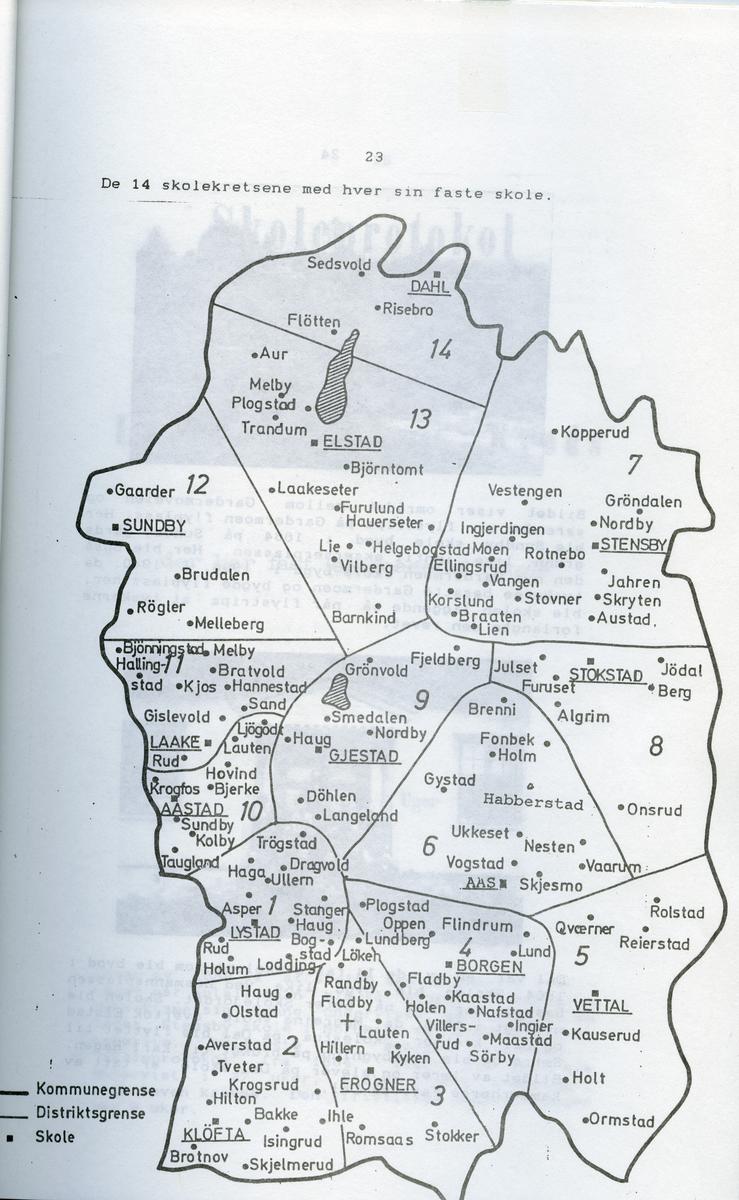 1864: Kløfta, Borgen , Aastad , Gjestad , Stokstad , Vettal , Stensby , Sundby , Laake , Elstad og Aas skole.