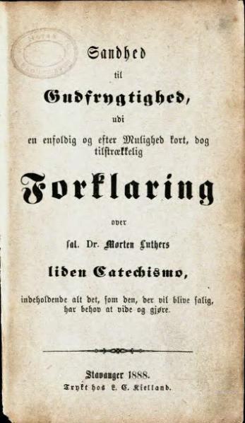 Bibelen var lære- og lesebok, og også Martin Luthers Lille Katekisme, som kom på tysk allerede i 1529. Dette er Erik Pontoppidans forklaring av Luthers lille katekisme, skrevet i 1739 til hjelp i konfirmasjonsundervisningen. Dette eksemplaret er fra 1888. Denne skulle i mange år pugges utenat.